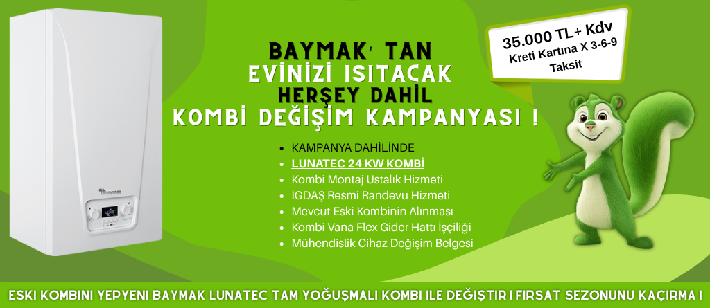 Kombi Değişim Kampanyası dahilinde sunduğumuz fırsatlar, eski kombinizin yerine seçtiğiniz kombiyle birlikte, nakliye,değişim belgesi, kombi montajı ve kredi kartına 3,6,9 taksit imkanlarından yararlanabilirsiniz.