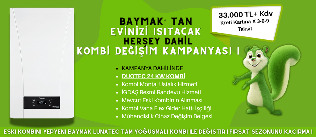 ESKİ YOĞUŞMASIZ KOMBİLERİNİZİ ALIYORUZ YERİNE DAİRENİZDE TASARRUF YAPACAĞINIZ SIFIR BAYMAK MARKA TAM YOĞUŞMALI KOMBİ’ NİZİ VERİYORUZ.